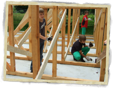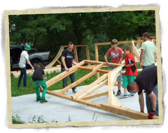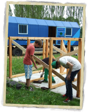 Die Jungs vom Wittichenauer Schulclub und die Biker von „Little Woodward“ beim Aufbau der Unterkonstruktion für die Rampe